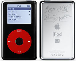 Rot und Schwarz sowie die Unterschriften auf der Rückseite machen das Gerät eigentlich recht ansehnlich. Auch bemerkenswert : Auf dem U2 iPod (omg) sind bereits alle Lieder von Janis Joplin. HA! Spass :P Natürlich von U2. Kosten soll das Ding 379 Euros, kein schlechter Preis, eigentlich - wenn man bedenkt dass U2 inzwischen so um die 400 Titel hat. Würde man den iTunes Store Preis von 99 Cent pro Lied ansetzen kommt man auf 396 Euro, also bekommt man den iPod quasi geschenkt, wenn man die Musik kauft... :D